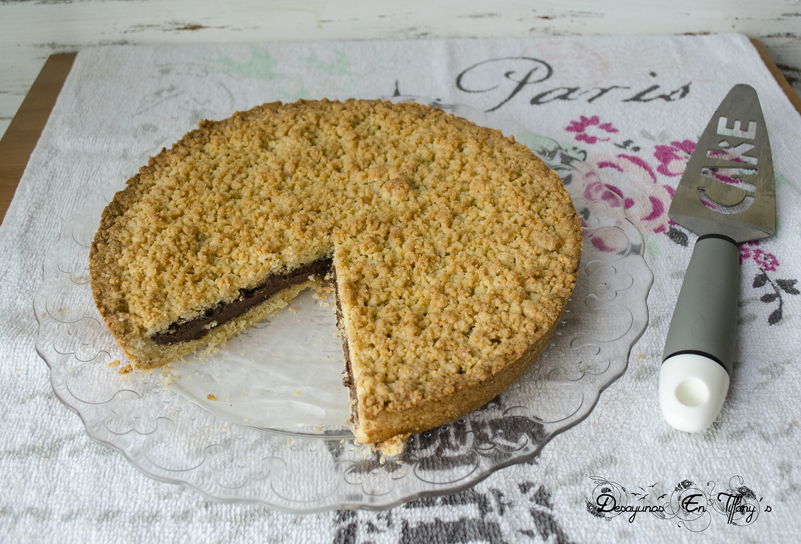 Rellenamos con la crema de cacao y repartimos por encima el resto de las migas de masa, dejándolas a su caer, sólo las sellamos un poquito con la mano en los bordes de la tarta.